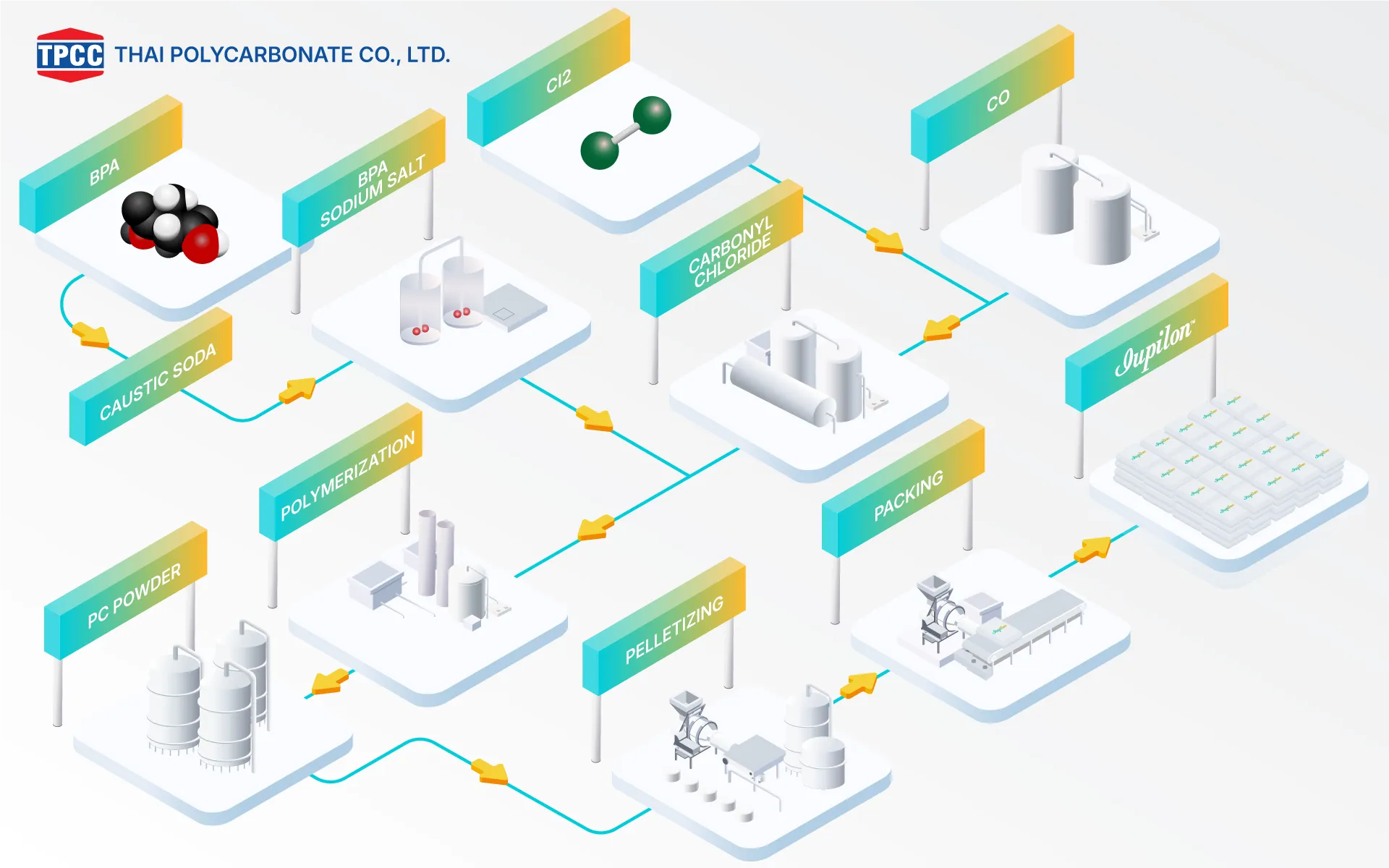 Our Commitment to Quality TPCC, the first producer of Polycarbonate resin in Southeast Asia, was established in May 1996, supplying both domestic and worldwide market with Iupilon™ polycarbonate resin. We offer a wide range of high-quality and have great care in providing technical services as well as abundance of application data.